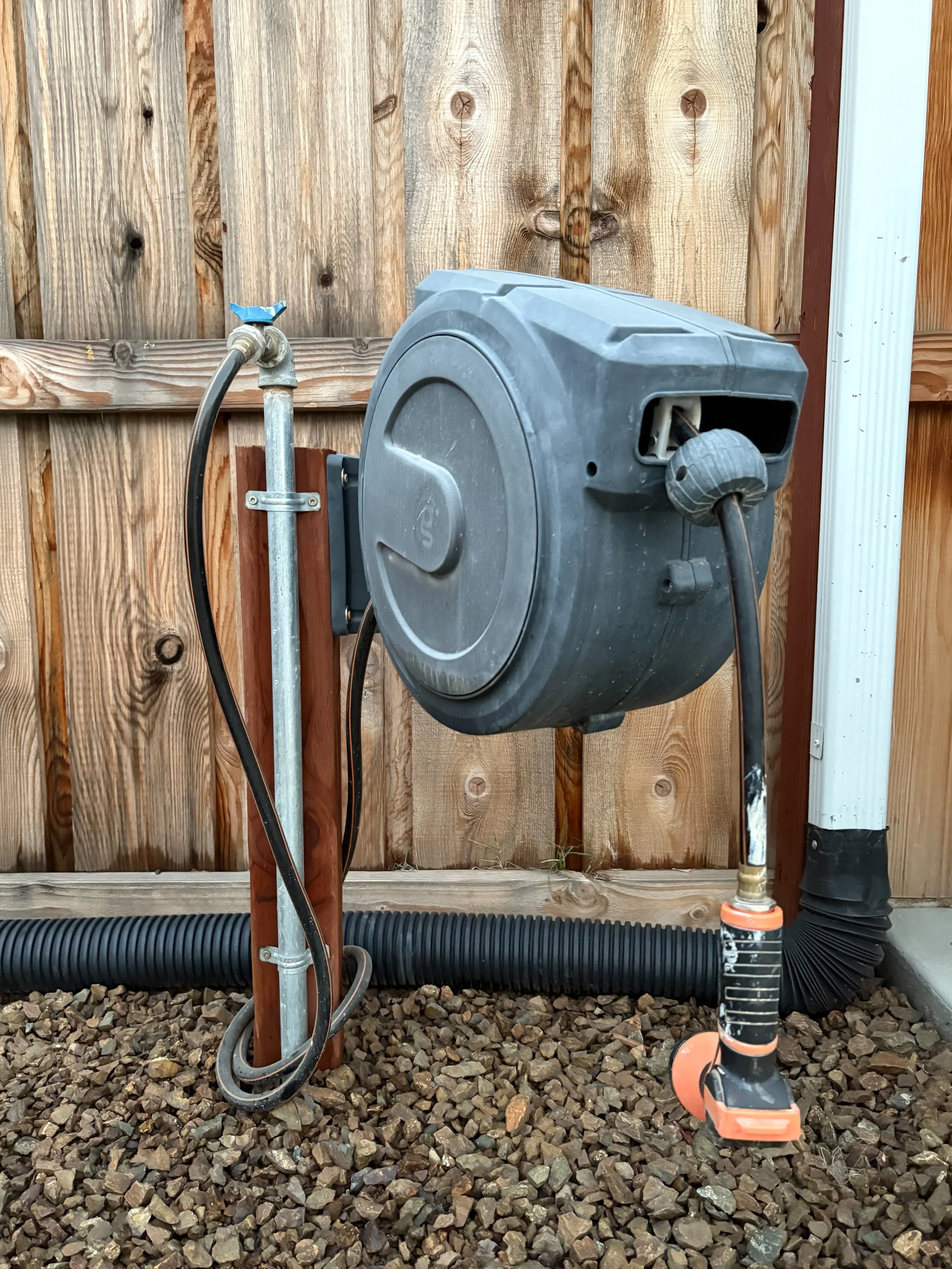Side view of a mounted retractable garden hose reel attached to a wood post with exposed plumbing line. Demonstrates professional exterior hose management and outdoor water system improvements performed by a local handyman.