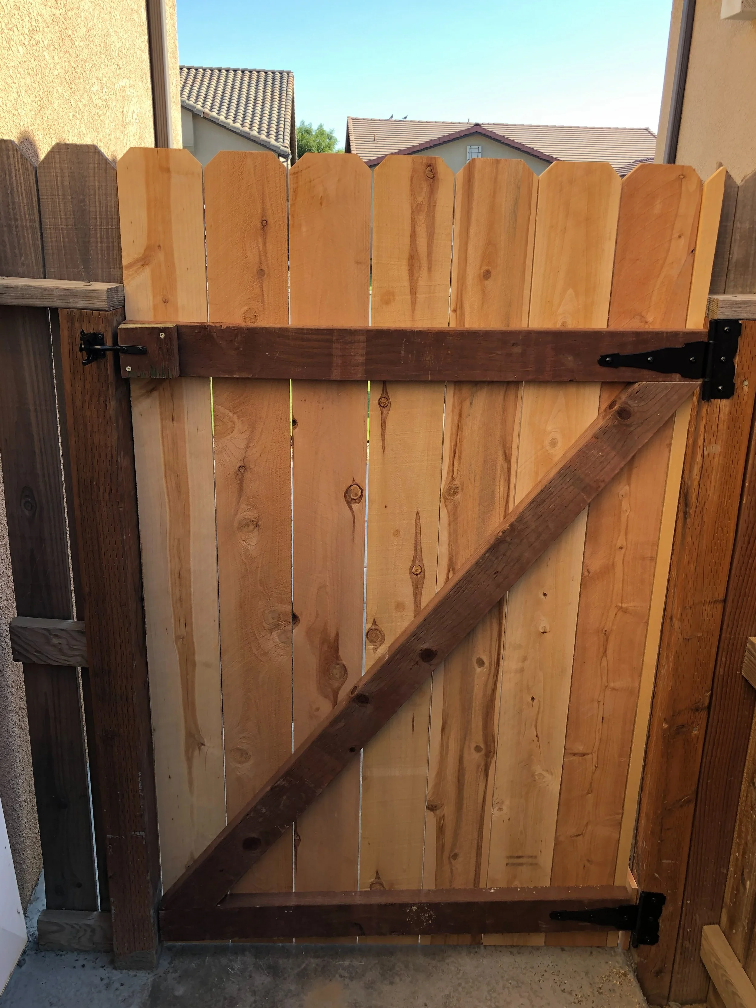Repaired wooden side gate with new boards and hardware installed by a Reedley handyman.
