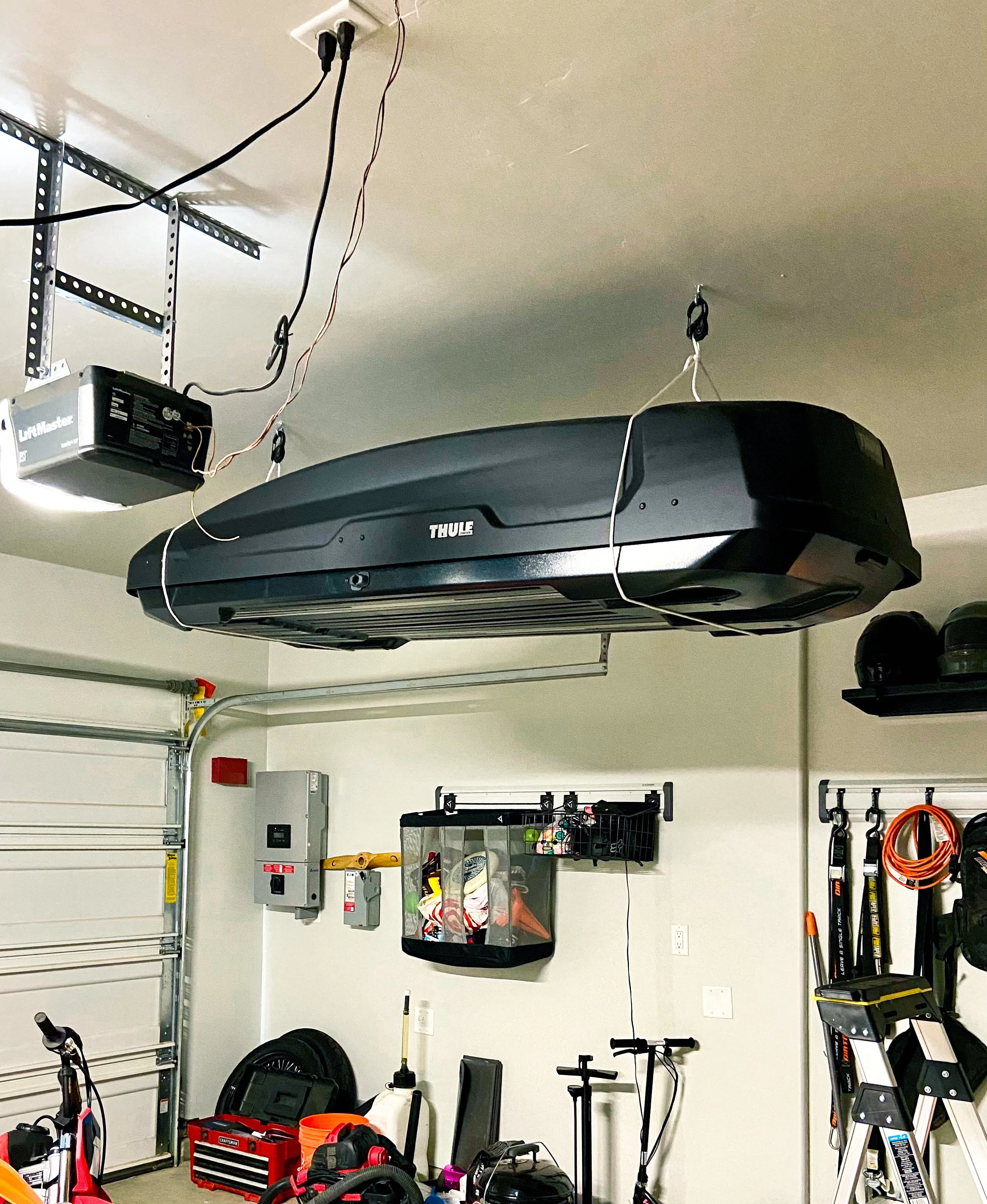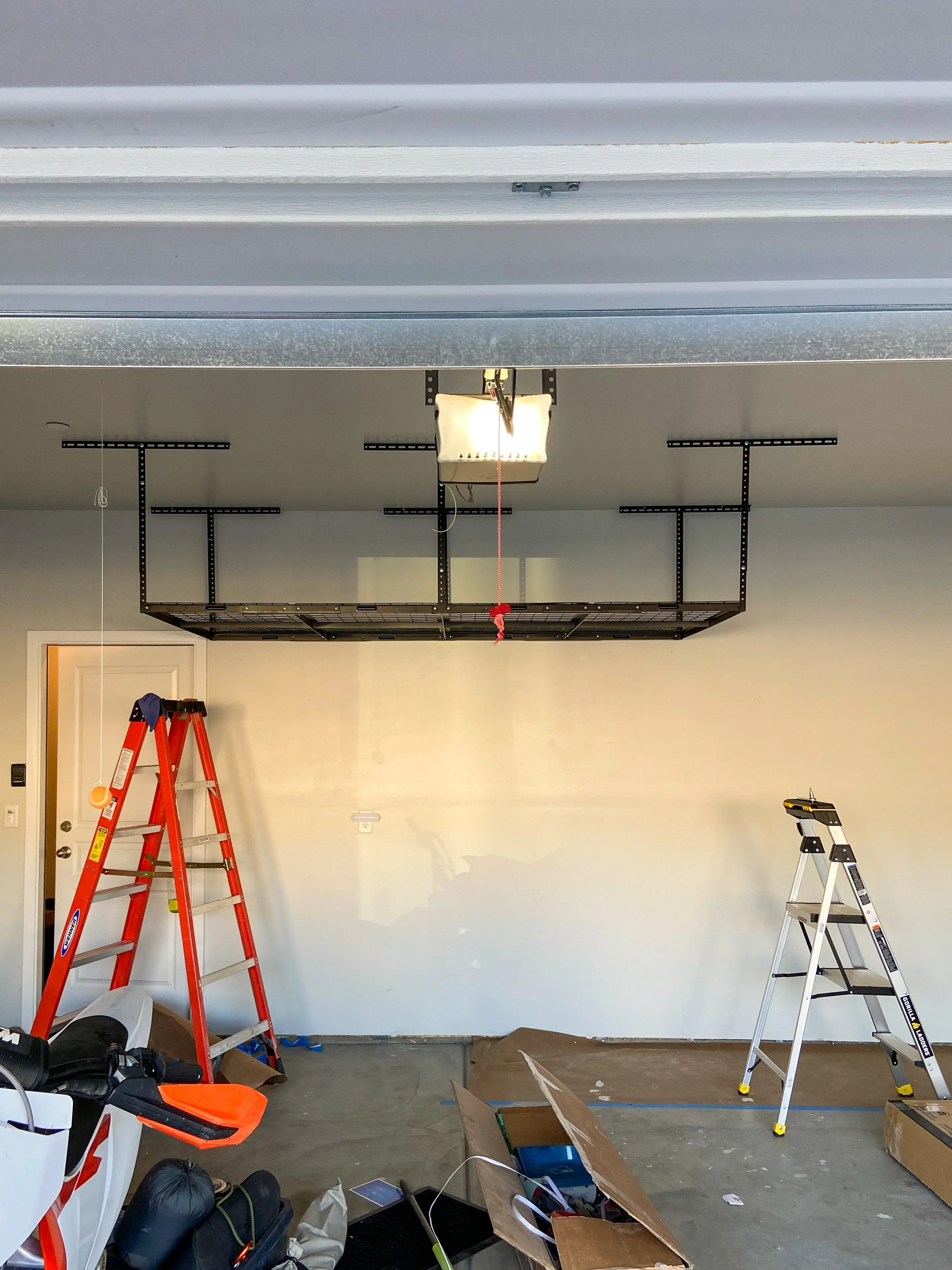 Reliable handyman from Everyday Home Services installing overhead garage storage rack in Visalia, California.