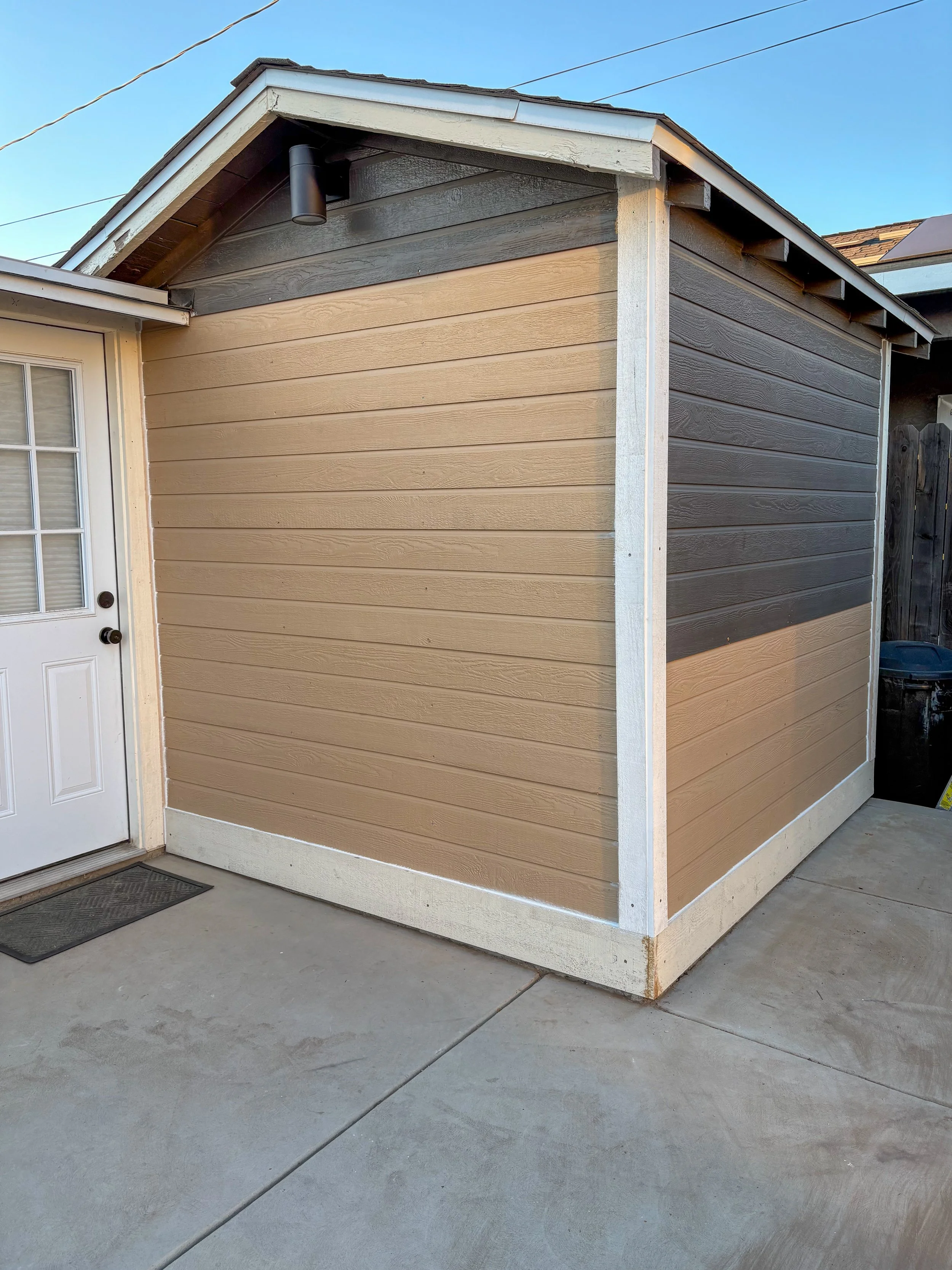 Freshly repaired and painted exterior siding with white trim on a residential structure in Reedley, CA. Highlights clean finish work, siding replacement, and exterior maintenance performed by a local handyman.