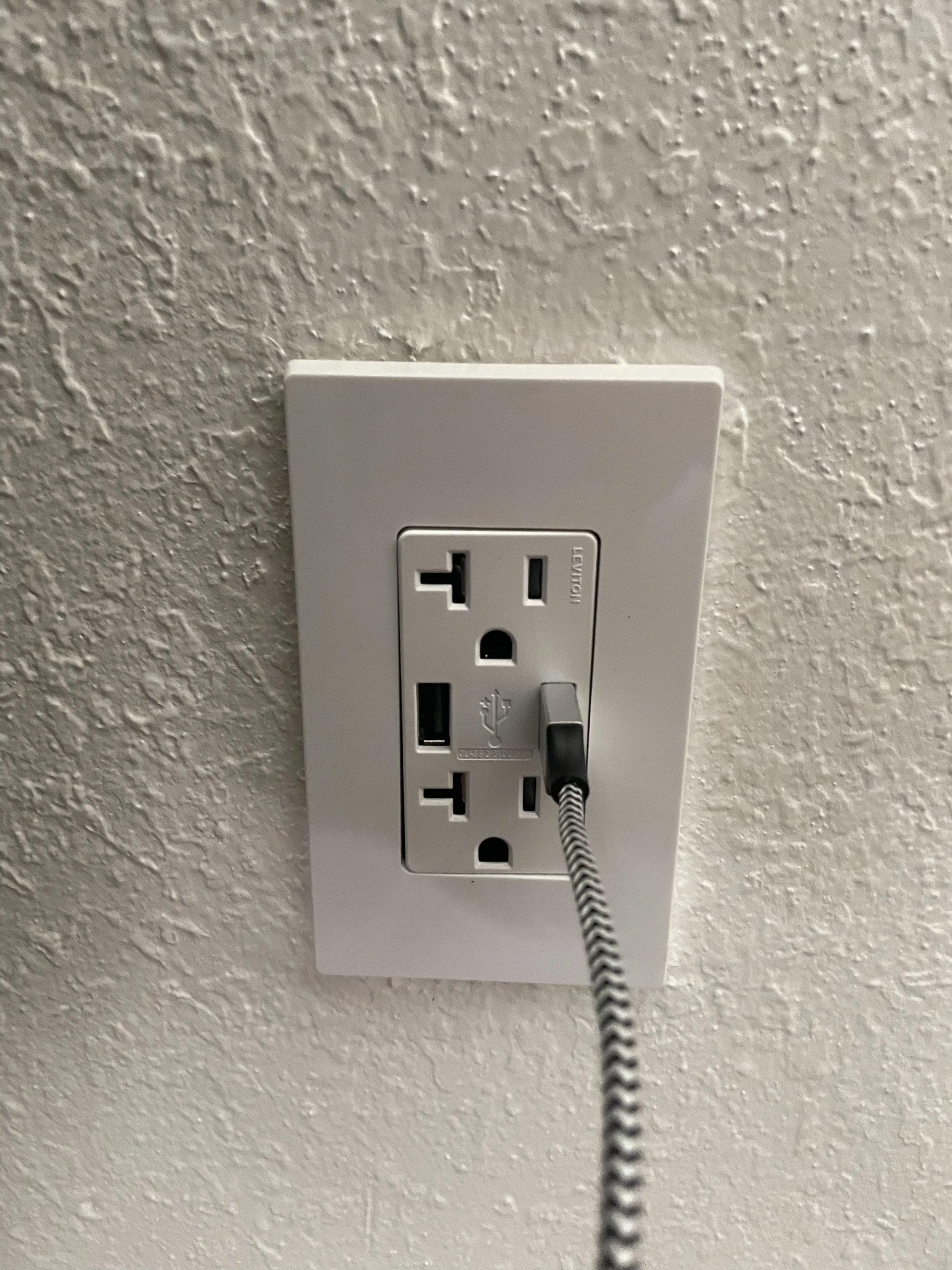 Upgraded electrical wall outlet with built-in USB ports installed by a Reedley handyman.